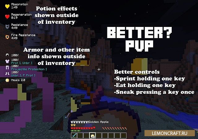 Мод на интерфейс для PvP боев Better PvP предназначен для изменения интерфейса игры для ориентации ее на проведение PvP боев. После установки мода на экран монитора будет выводится информация о здоровье, уроне и какие эффекты в данный момент действуют. Если нажать кнопку F вы сможете быстро восстановить свое здоровье.